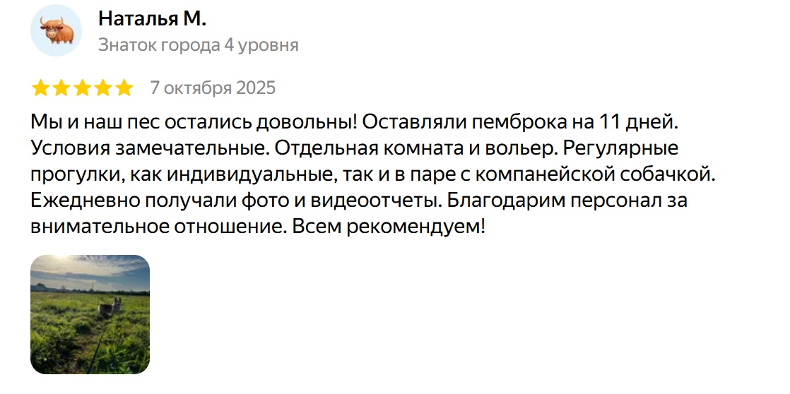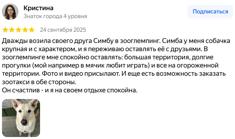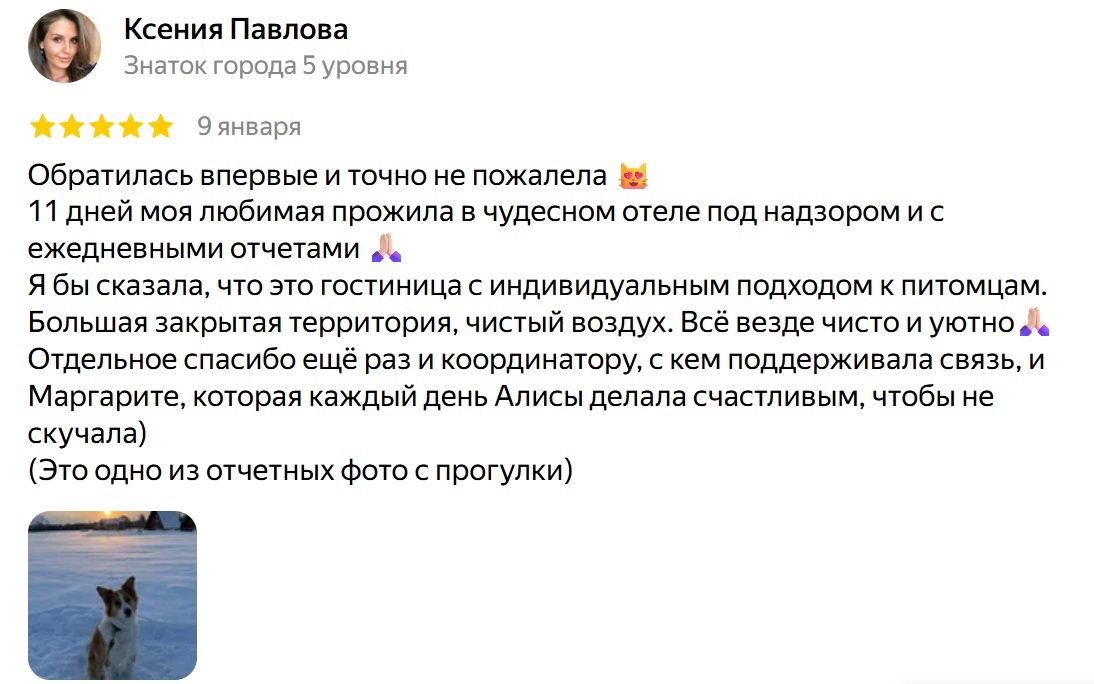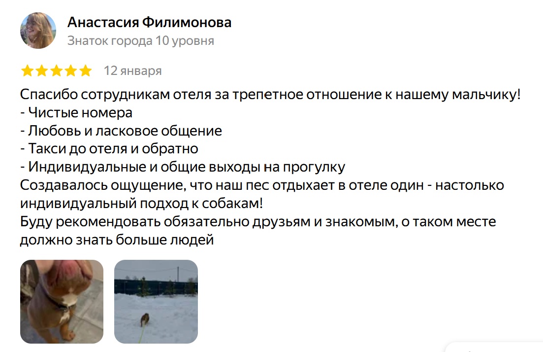 Индивидуальный подход к каждой собаке: выгул 2-3 раза в день, питание, игры